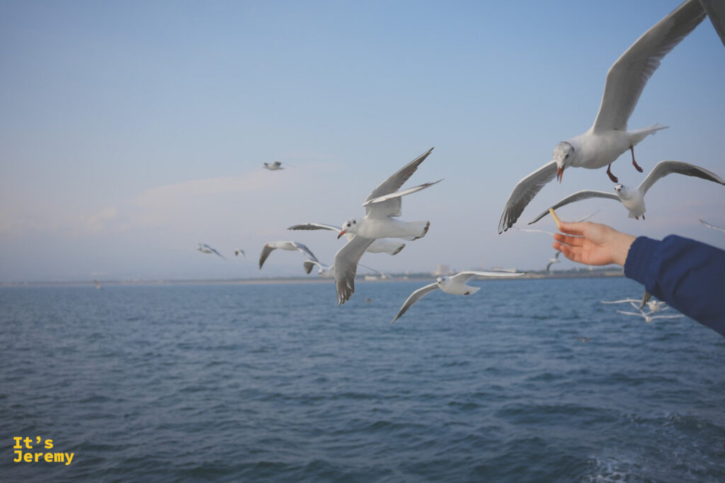 沼津港的遊覽船通常會提供特別的「餵食體驗」。當船隻駛離港口後,會有大量海鷗甚至老鷹跟隨船隻飛行。遊客可以購買蝦餅等小點心,在甲板上近距離享受與這些海鳥互動餵食的樂趣,這通常是整個航程中最令人興奮的部分。