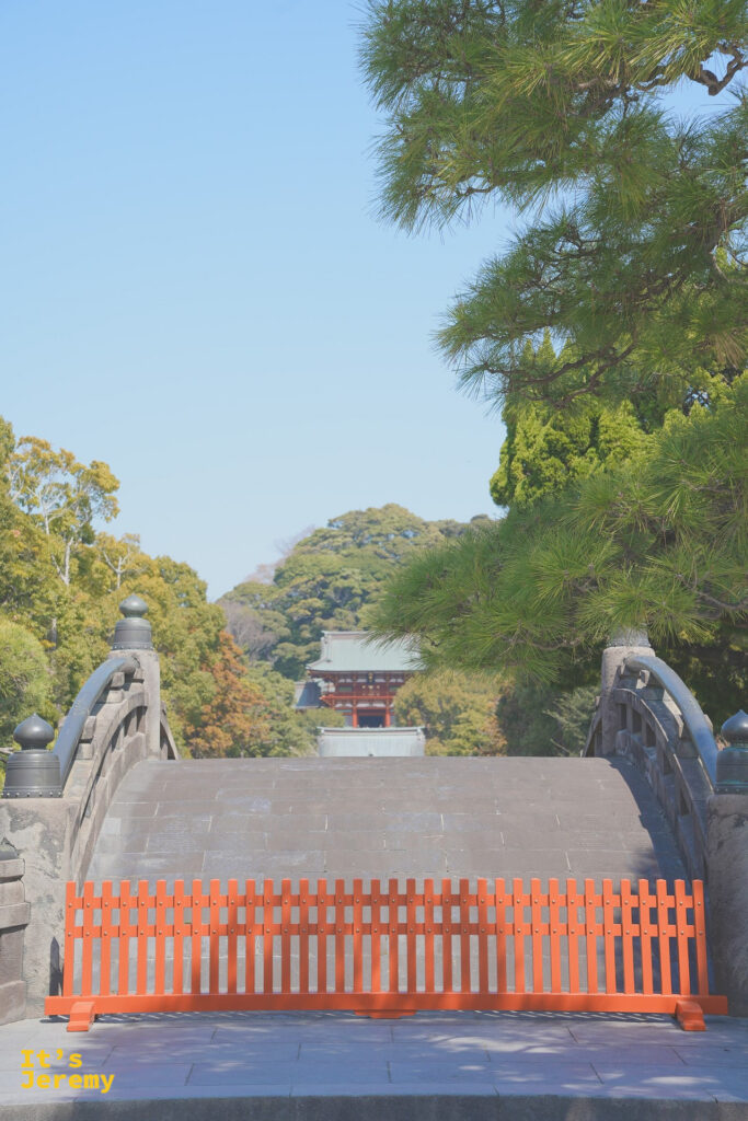 神社境內最引人注目的就是那抹亮眼的朱紅色,象徵著神聖與權威。在進入主要社殿區之前,會經過一座造型優美的朱紅色拱橋,俗稱「太鼓橋」。它橫跨在源平池(由源賴朝命人開鑿的池塘)之上,造型古典。