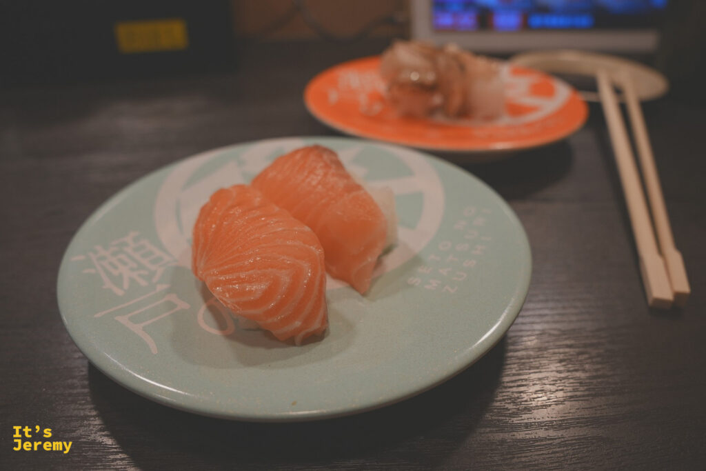 經典紅肉與鮭魚:新鮮的鮭魚切片厚實飽滿,紋理清晰可見。而鮪魚則呈現出亮眼的紅色,有些刷上了特製的醬汁並撒上芝麻,增添了濃郁的風味。